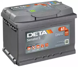 Battery Brand: DETA Battery Code: DA612 Voltage: 12 V Battery Capacity: 61 AH Cold Cranking Amps (CCA): 600 A Length: 242 Width: 175 Height: 175 Post Positions: 0 Terminal Type: EN Hold-down Type: B13 | |